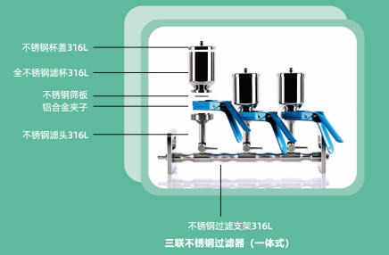 1、在过滤过程中,采用一体化的解决方案,配套无污染的无油隔膜真空泵。整套过滤系统可以在实验室、洁净室、超净工作台上安全放置和高效操作。